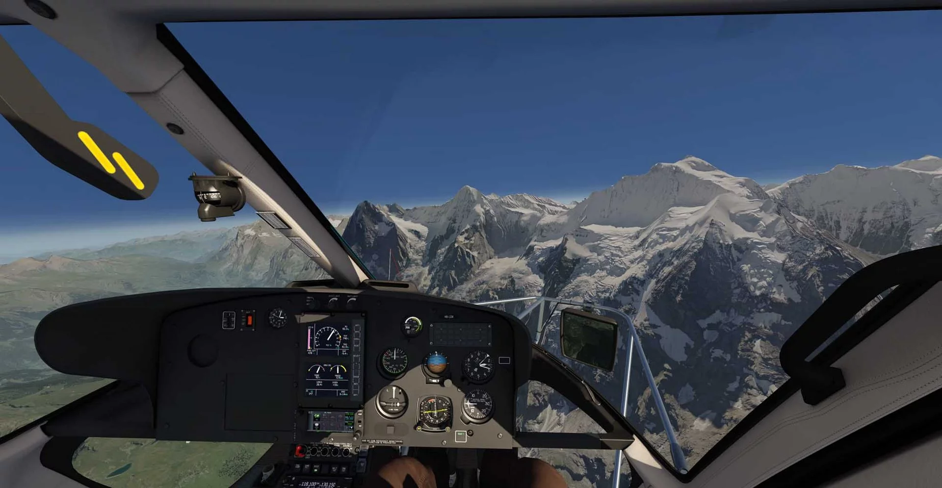 A lightweight premium VR headset provides a natural 360° 3D view. Head-tracking and a human pose-recognition system render a realistic avatar of the pilot, so all relevant controls can be reached and operated intuitively. High-resolution, photorealistic sceneries support precise maneuvering, including vertical-reference operations.